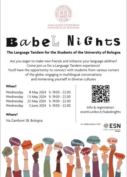 Ti va di portare il tuo scambio culturale al livello successivo? Unisciti a noi nelle Babel Nights, la nuova attività organizzata da ESN Bologna in collaborazione con l'Alma Mater per imparare nuove lingue! Le Babel Nights mettono insieme il piacere di studiare una lingua, un ambiente internazionale e la possibilità di fare nuove amicizie in una serie di eventi in cui acquisirai sicurezza nel parlare una lingua straniera mentre ti diverti! Che tu sia uno studente italiano o internazionale (compresi gli studenti in scambio/Erasmus) sei il benvenuto: puoi scegliere di insegnare o imparare una delle tante lingue che verranno proposte. Noi forniremo argomenti e materiali coinvolgenti per rendere la tua esperienza il più divertente e serena possibile, lasciandoti libero di sperimentare e di conoscere, oltre alle regole grammaticali, la cultura e le tradizioni dei tuoi compagni. Se sei uno studente curioso di parlare una nuova lingua, migliorare una che già conosci o desideroso di condividere la tua stessa cultura e lingua madre, fatti avanti! Nuovi amici e tanto divertimento ti aspettano e, chissà, potresti conoscere qualcuno che sa cucinare il tuo piatto preferito... Se tutto ciò ha stuzzicato il tuo interesse, vieni a trovarci! DOVE? Via Zamboni 38, proprio nel cuore della vita universitaria